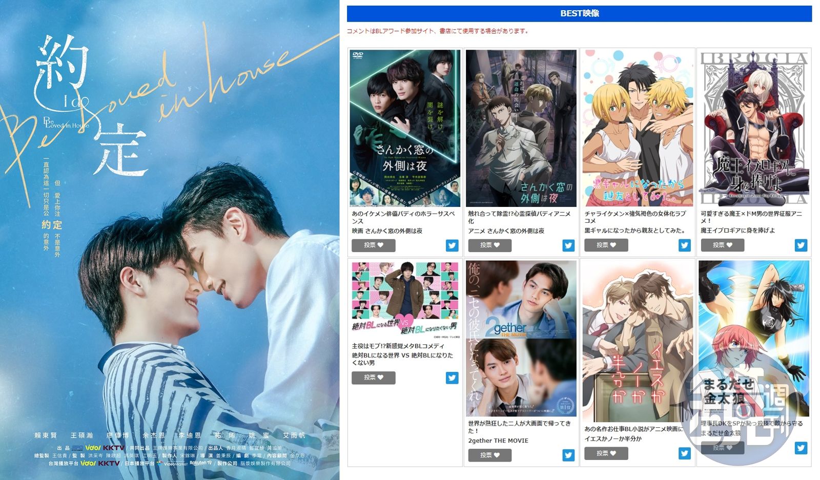 值得一提的是,近年受到海外BL粉矚目的台劇也有入圍,紅到日本的《Be Loved in House 約·定-I Do》將和來自中、港、泰、日、韓的作品角逐最佳影片獎項,作品已在Vidol、KKTV上架。粉絲可登錄Chill Chill網站取得會員帳號參與投票,活動頁面可參考https://www.chil-chil.net/blAwardNominate/e/2022/t/1/。
