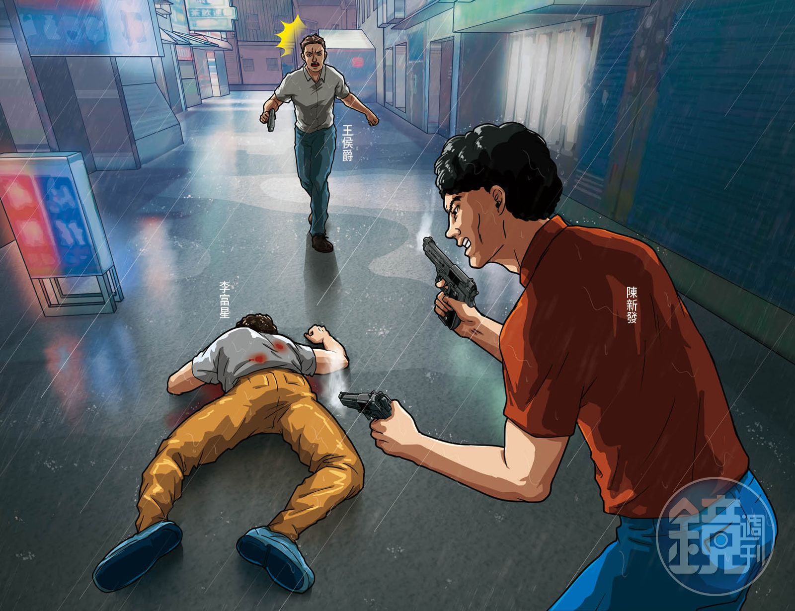 王、李2人抵達飯店附近後,王先到周遭查探,李則因call機響起,到路邊尋找公用電話準備回電時,被在吃自助餐的陳新發看見,陳隨即拔出雙槍,朝李背後開槍,李頭部中彈、倒地不起,陳又對李補了2槍,正要逃跑,王聽到槍聲,趕到現場,與陳當街駁火,嚇壞所有民眾。