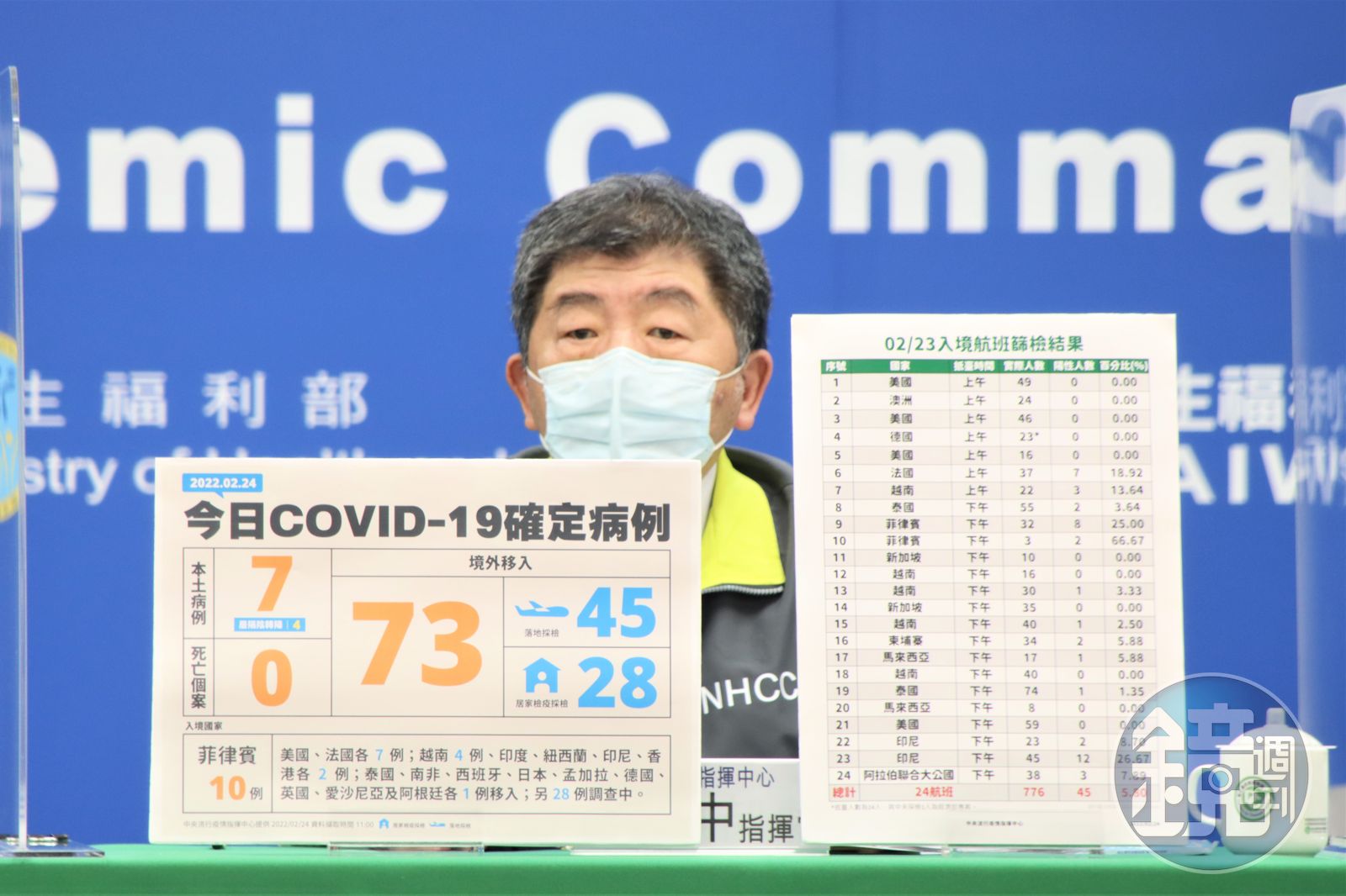 指揮中心說明,今天新增境外移入個案為43例男性、30例女性,年齡介於未滿5歲至70多歲,分別自菲律賓(10例)、美國及法國(各7例)、越南(4例)、印度、紐西蘭、印尼及香港(各2例)、泰國、南非、西班牙、日本、孟加拉、德國、英國、愛沙尼亞及阿根廷(各1例)移入;另28例調查中。入境日介於今年2月4日至2月23日。