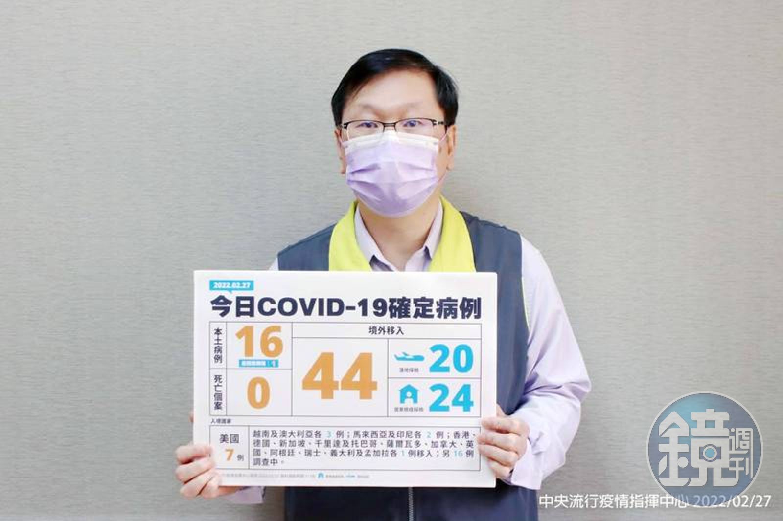 今天新增44例境外移入個案中,共有25例男性、19例女性,年齡介於未滿5歲至70多歲,分別自美國(7例)、越南及澳大利亞(各3例)、馬來西亞及印尼(各2例)、香港、德國、新加坡、千里達及托巴哥、薩爾瓦多、加拿大、英國、阿根廷、瑞士、義大利及孟加拉(各1例)移入,另16例調查中。入境日介於今年2月12日至2月26日。
