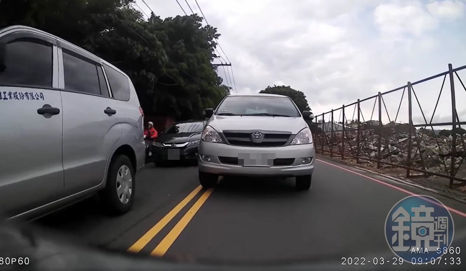 原PO在「爆廢公社」發文,表示自己開車經過新莊堤防附近,遇到對向一台塞在車陣中,不想乖乖排隊的車輛,竟違規跨越雙黃線想超車搶快,結果原PO剛好開到違規車面前,霸氣停住不讓,兩台車就這樣面對面僵持不下,最後違規車輛只好倒車回去原本的車陣中。