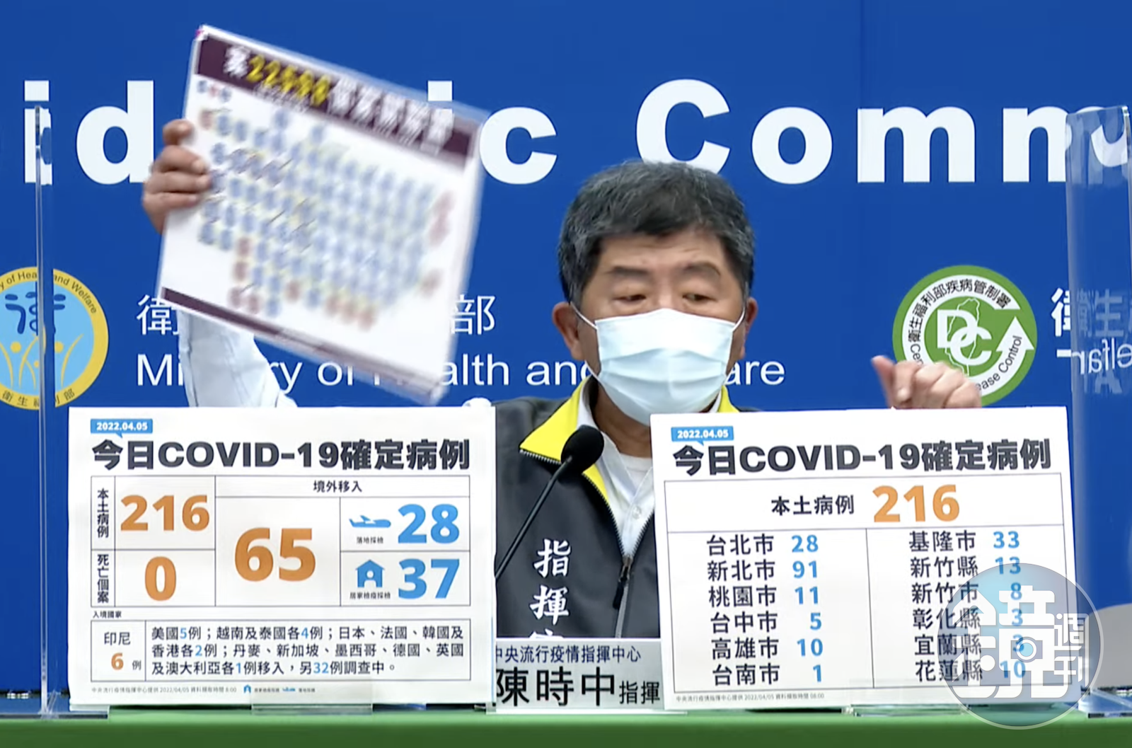 指揮中心表示,今日新增之216例本土病例,為100例男性、116例女性,年齡介於未滿5歲至90多歲,發病日介於3月14日至4月4日,其中包含114例為無症狀感染。個案分佈為新北市91例、基隆市33例、台北市28例、新竹縣13例、桃園市11例、高雄市及花蓮縣各10例、新竹市8例、台中市5例、宜蘭縣及彰化縣各3例、台南市1例。相關疫情調查持續進行中。
