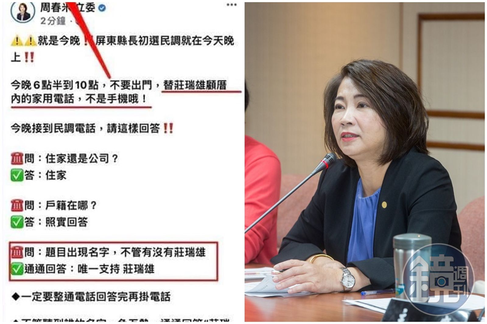 民進黨屏東縣長初由立委周春米、莊瑞雄、鍾佳濱展開廝殺,今晚6點至10點進行家用電話民調,可就在民調開跑前,周春米的臉書粉專竟發文要支持者接到電話,通通回答「唯一支持莊瑞雄」。