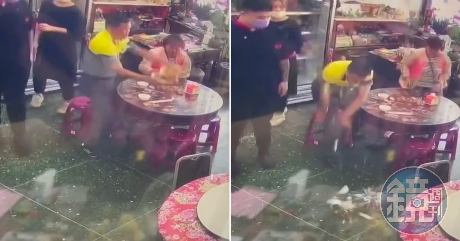 根據影片畫面,她不停碎念抱怨,她的老公突然伸出雙手抓起桌上兩盤菜,高舉過頭再往地上重重一摔,婦人同時以迅雷不及掩耳的速度起身準備離開混亂現場,離去前還與錯愕的員工發生口角,全場都看傻了眼。