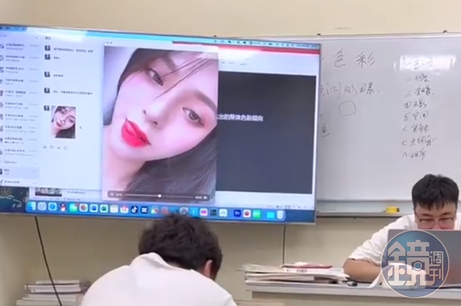 從影片中可見,這名王姓美術課老師在課堂上安排了學生們的繪畫課程後,竟收到來自女友的自拍短片,對方詢問「新買的口紅好看嗎」,王老師則回「這顏色太勾人啦!我寶真漂亮,嘿嘿」,殊不知這一連串對話紀錄,硬生生呈現在教室的投影布幕上。