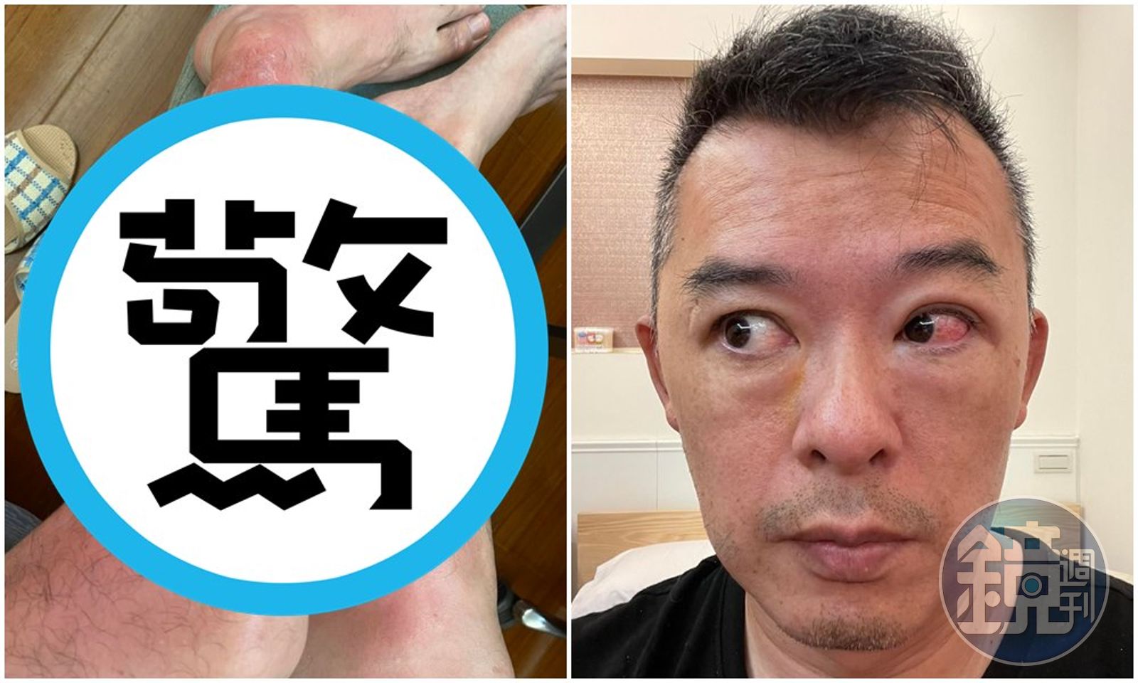 Andy老爹今(13日)在臉書貼出受傷照表示,「前晚(11日)拿了紫外線殺菌燈放在房間想要來消毒殺菌,結果3個小時後,我的雙腿燙傷了,兩個眼睛也受傷了,兩眼都打不開,所以半夜跑去掛了急診,醫生說眼角膜受傷,所以要修養個幾天,兩條腿也整個燙傷,所以包的跟木乃伊一樣。」