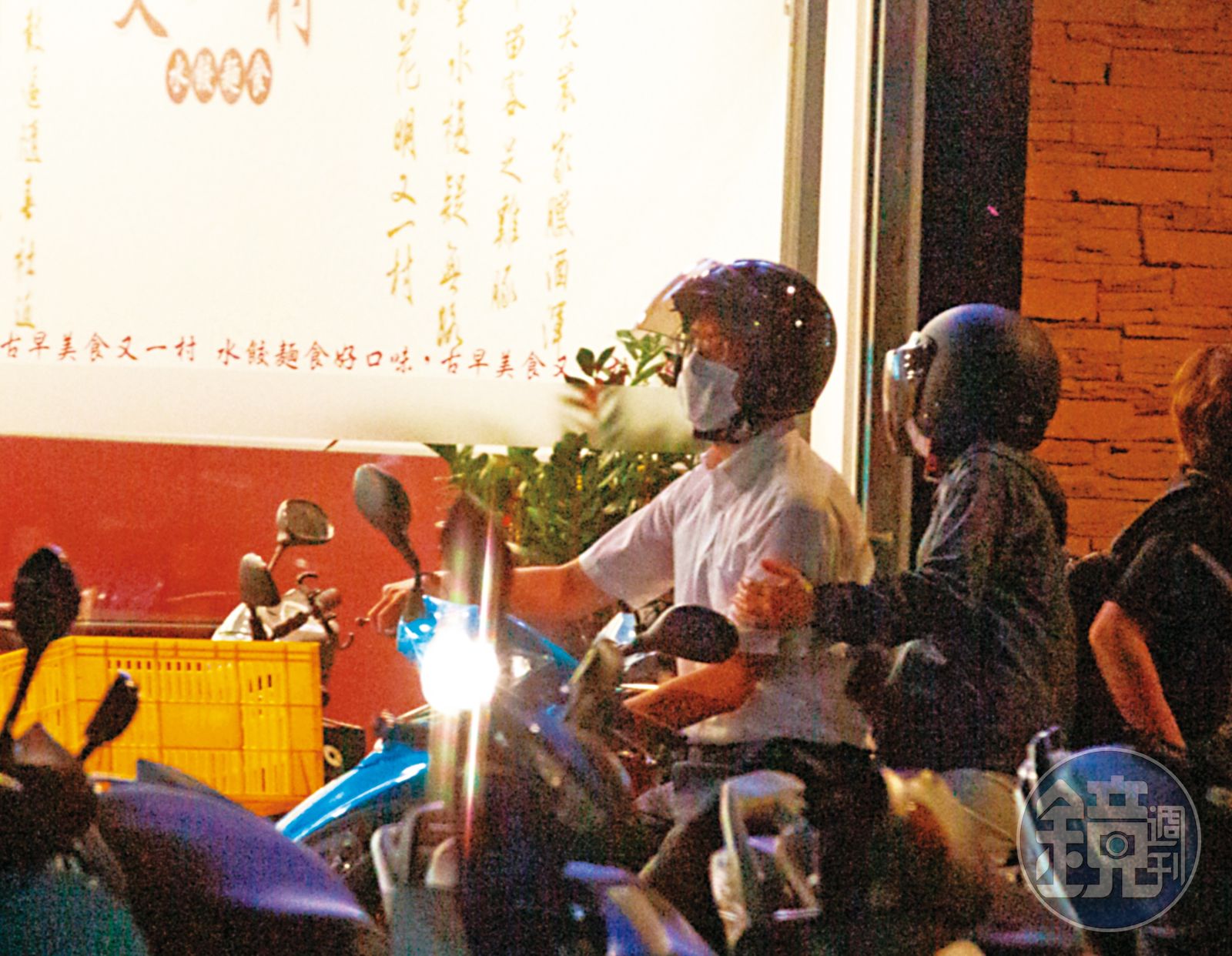 在條通獨處2小時後,鄒宇新(左)先獨自走向停車處,隨後現身的廖女(右)已戴好全罩式安全帽且左顧右盼,似怕被人認出。本刊直擊,鄒與廖在公開場合互動,不論大街或巷弄,只要有人的地方,二人都會刻意保持安全距離,在條通商圈約會那晚,二人準備離開時,也是由鄒先取車,隨後抵達的廖卻早已戴好全罩式安全帽,並不時左顧右盼,一副深怕熟人認出的模樣,經再三確認沒人注意才坐上鄒的機車。