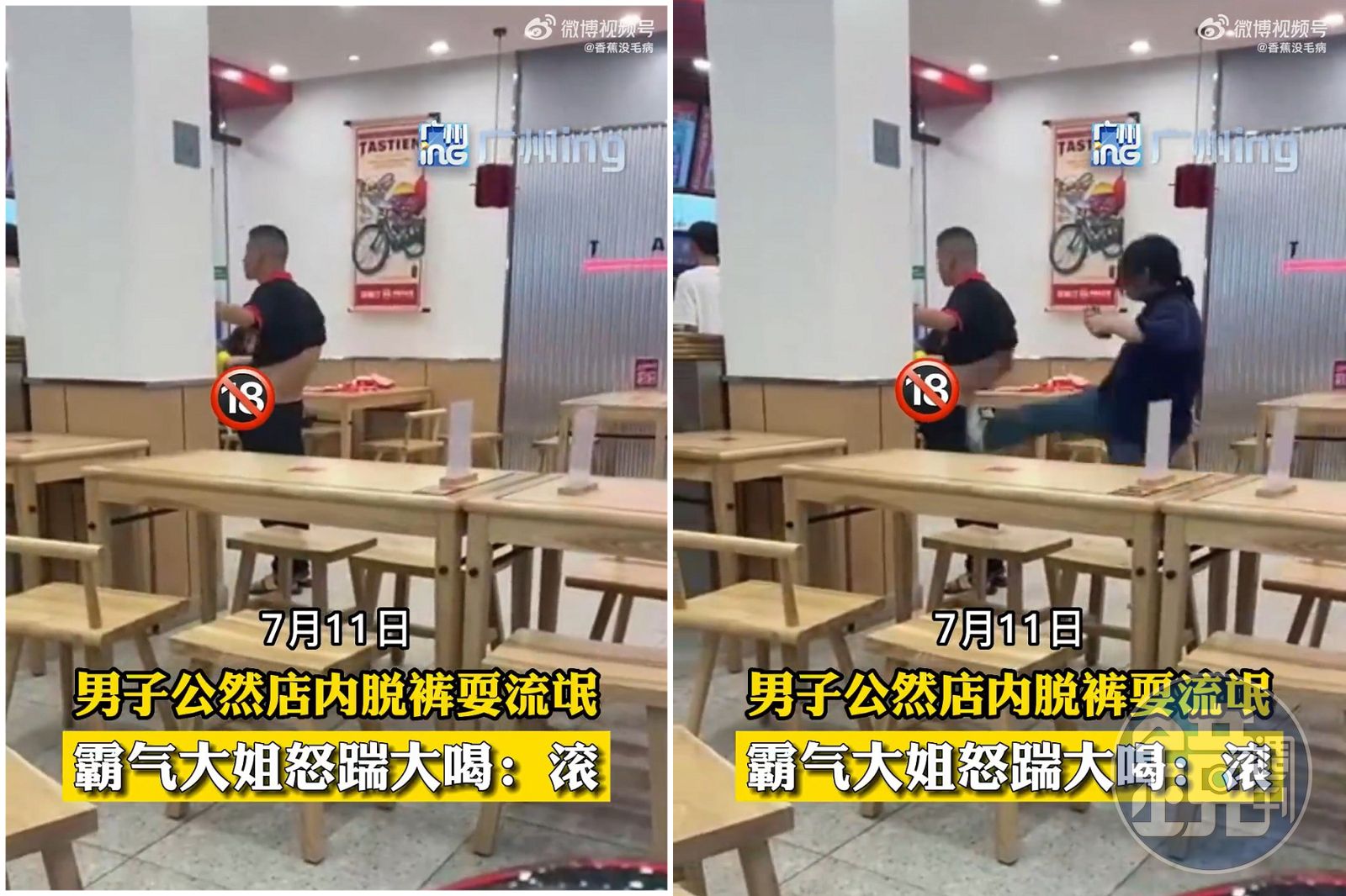 中國微博網友今日瘋傳這段影像,這名噁男疑似在店裡無理取鬧,之後更直接脫褲,露出下體。但一名身材壯碩的女子突然出現,更霸氣使出「無影腳」,狠狠地對噁男下半身直接踹下去。明顯可見,噁男的力氣不敵霸氣女,一路被霸氣女踹爆,踢出餐廳。