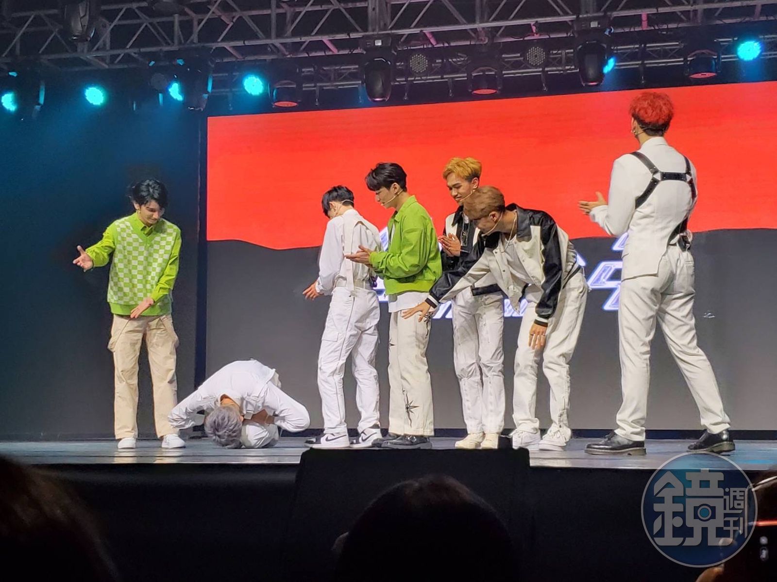 一向就非常有禮貌的林煥鈞(左二)當場在台上「土下座」,謝謝所有粉絲和力挺他的原子兄弟。發布時間:2022.07.16 18:10 臺北時間