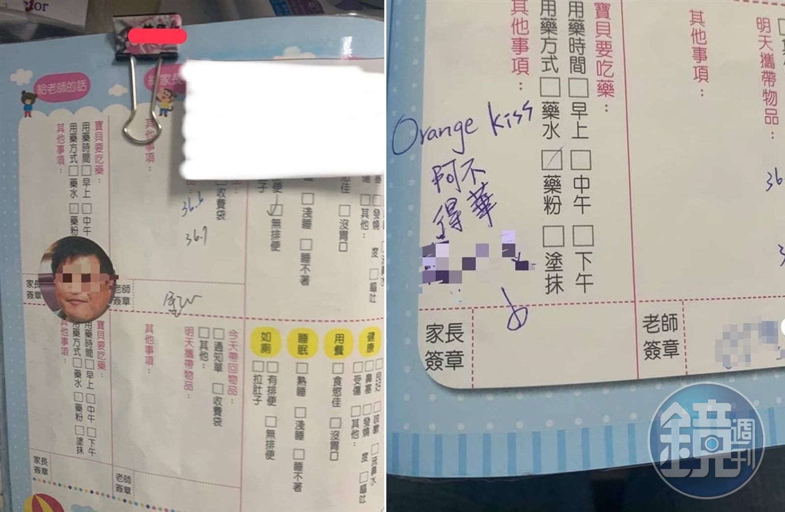 這名人妻在臉書社團「爆廢公社」發文,附圖是這幾天老公替兒子簽聯絡簿的傑作,只見老公大剌剌在家長簽章處貼上自己大頭照,另一天則簽名「Orange kiss阿不得華」。