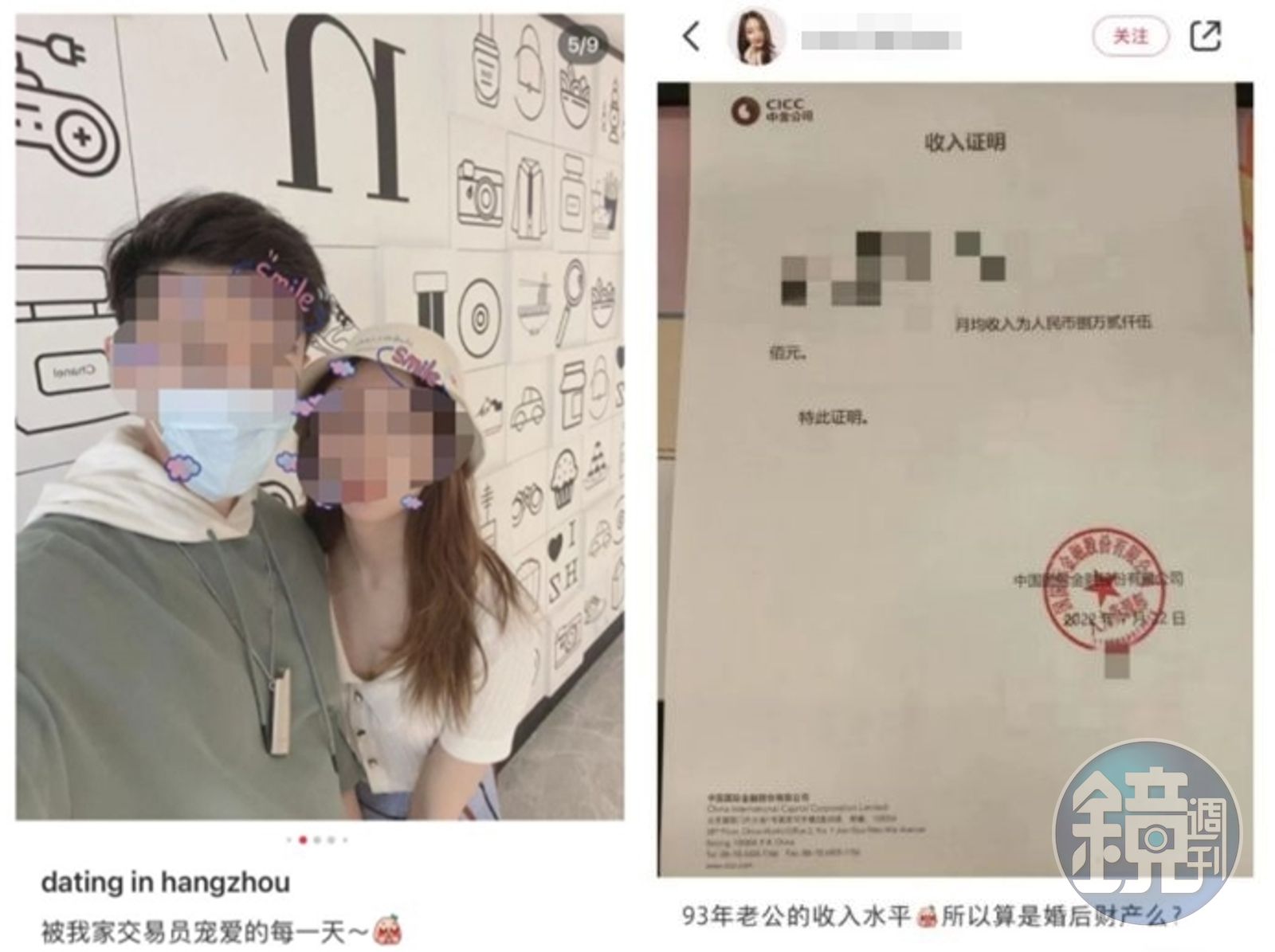 綜合中國媒體報導,有一名90後(八年級生)券商交易員的月薪收入超過8萬人民幣的擷圖在中國社群平台瘋傳,但貼出薪資證明的不是員工本人,而是他的妻子。從擷圖可見,一名貌美人妻在社群平台「小紅書」曬夫妻合照,還附上由中國國際金融公司開立「月均收入82500元人民幣(約新台幣37.2萬元)」的收入證明。