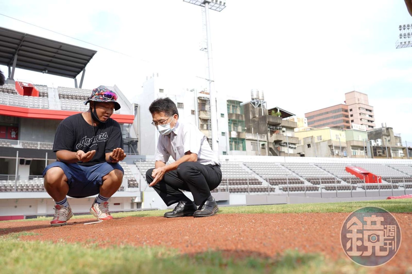 林家緯表示,目前場內紅土不全然適合球員使用,建議移除表層較鬆軟部分,即可利用機具將底層整平,再經灑水、沉澱,也可連同可能的積水處一併改善,待場地狀況良好,再鋪上新的紅土,達到改善。他也現場拿出5種土逐一解釋,包含韓國、日本職棒場地紅土,典型台灣紅土,以及進口陶瓷土、火山岩紅土。