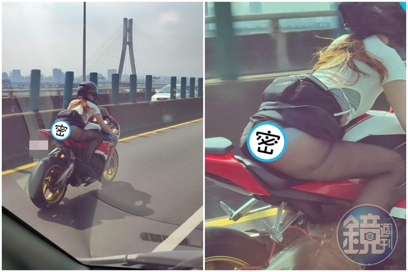 只見網友分享的兩張照片,長髮正妹穿著窄裙配黑絲襪,似乎因為跨坐重機上動作太大,加上強風,裙襬不自覺往上撩,裙內裡面透膚黑絲襪以及白色三角內褲霸氣外露,本人還渾然不知。