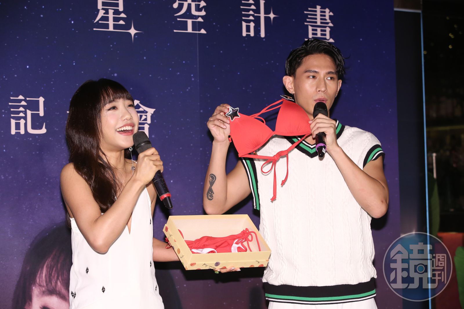 而曾在蔡佩軒的MV中擔任男主角的師弟柏霖,也在記者會送上紅色比基尼祝福,不僅是慶祝蔡佩軒皮膚變好,更希望她的新作品能紅紅火火,「師姐最忙於新作品都沒有時間去戶外走走,天天都在錄音室趕工,所以希望今年夏天有機會一起去海邊玩,放鬆一下!」讓Ariel十分感謝柏霖的貼心,但超性感比基尼讓她大笑說:「會有點害羞!」