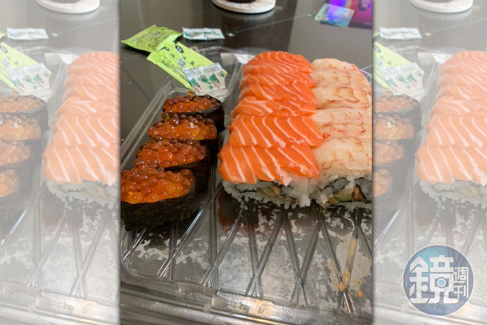 據原po分享的壽司照片可見,鮭魚和鮮蝦握壽司底下不是單純白飯,而是包滿料的花壽司,裡面有包魚肉、黃瓜、海苔等,看起來相當豐富。