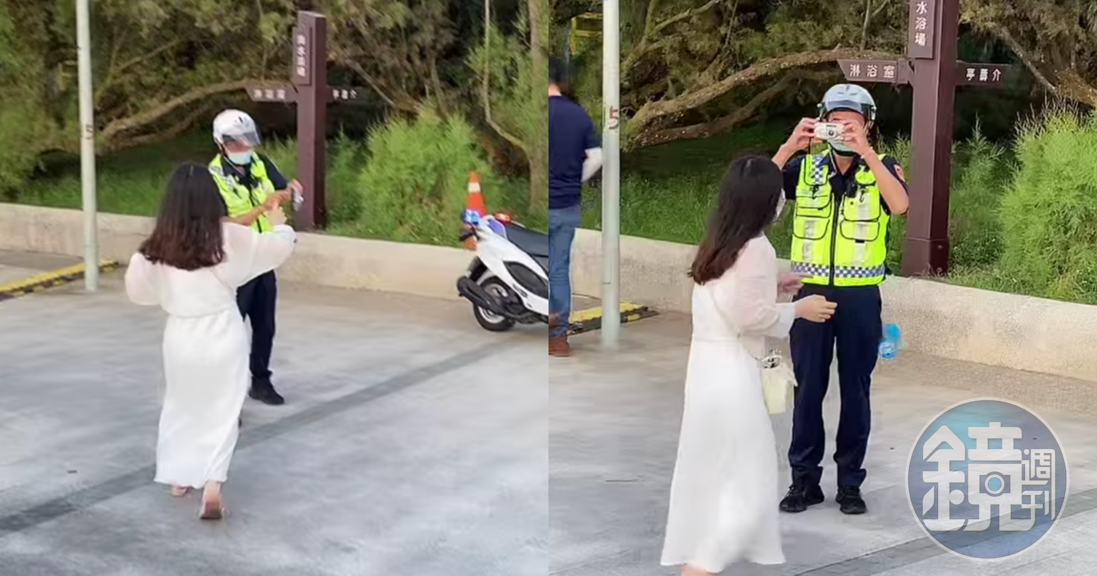 一名網友在臉書社團「爆廢公社公開版」分享一支影片,短短寫下「國家級攝影師」6個字,並標註這是在澎湖,影片中可以看到一名長髮及胸、穿著白色長洋裝的年輕女子,看似在跟警察叔叔討論什麼,原以為是在為開單討價還價,沒想到警察下一秒舉起相機準備拍攝,女子則是雀躍地小跑步到隊伍裡合照。