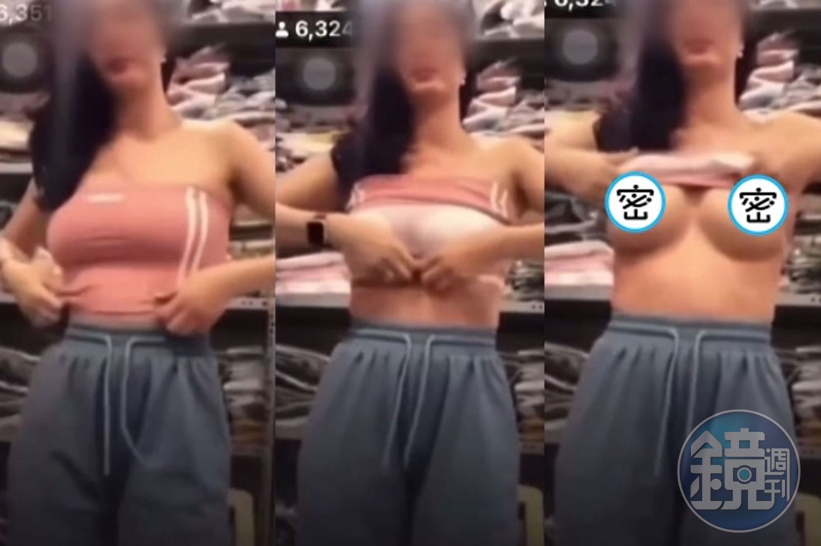 正妹一層一層的掀開衣服,甚至還掀開了最後一層透明附有罩杯的內襯墊,直接露出胸前無碼「兩顆小粉紅」,頓時正妹才恍然大悟「沒做好防護措施」,嚇一個趕緊把小可愛翻下來,並查看有多少人在線觀看,但為時已晚,因為當時有6千多名觀眾,事後正妹尷尬得不知所措一直用雙手護著自己的胸部,似乎為了自己忘了貼胸貼感到懊惱。