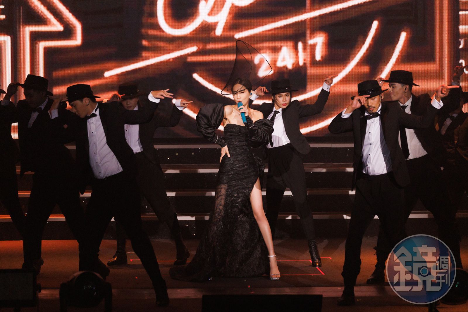 Ella陳嘉樺今(20日)晚在高流舉辦《艾拉秀》,開場以〈A CA ELLA〉高唱破題,Ella宛如「黑天鵝」般造型,以一席黑色訂製服、戴著一頂50公分的手工黑紗帽、搭配緞面鑽飾手套,天后「露胸、露背又開高衩」,她直呼:「高雄,艾拉秀我們終於來了!這巡演從39歲到41歲了,不是『老當益壯』而是『寶刀未老』。」