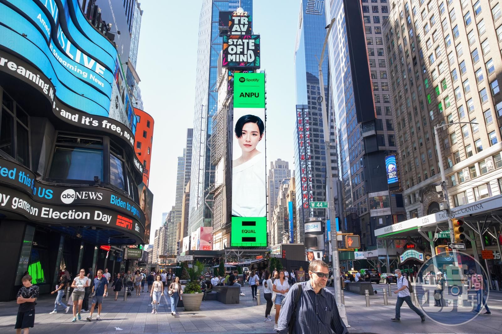 安溥登紐約時代廣場的巨型LED屏幕,為Spotify EQUAL Taiwan 8月份封面人物。(聯成娛樂提供)發布時間:2022.08.26 11:30 臺北時間