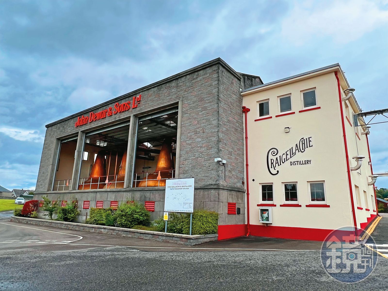 看到酒廠外牆上大大的John Dewar & Sons Ltd字樣,會誤以為這是「帝王」酒廠,其實魁列奇(Craigellachie)Logo就在旁邊。