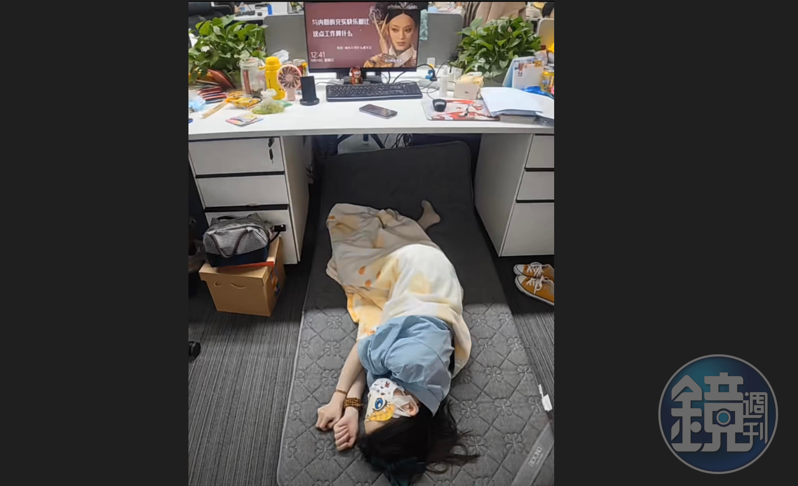 有網友在《爆廢公社公開版》上傳照片,照片中只見一名女生戴眼罩,在地上舖床墊、蓋小被子,直接睡在辦公桌下,相較一旁男同事趴在桌上午休,女子大膽行徑引起網友熱議,有人直呼「好強喔」「老闆要給他加薪!以公司為家」「只要她不覺得尷尬,尷尬的就是別人」「公司就是我家」,也有人打趣說「應該順便敷個面膜」「缺個枕頭」,但有些人擔心「太接近地下,真怕有蟑螂」。