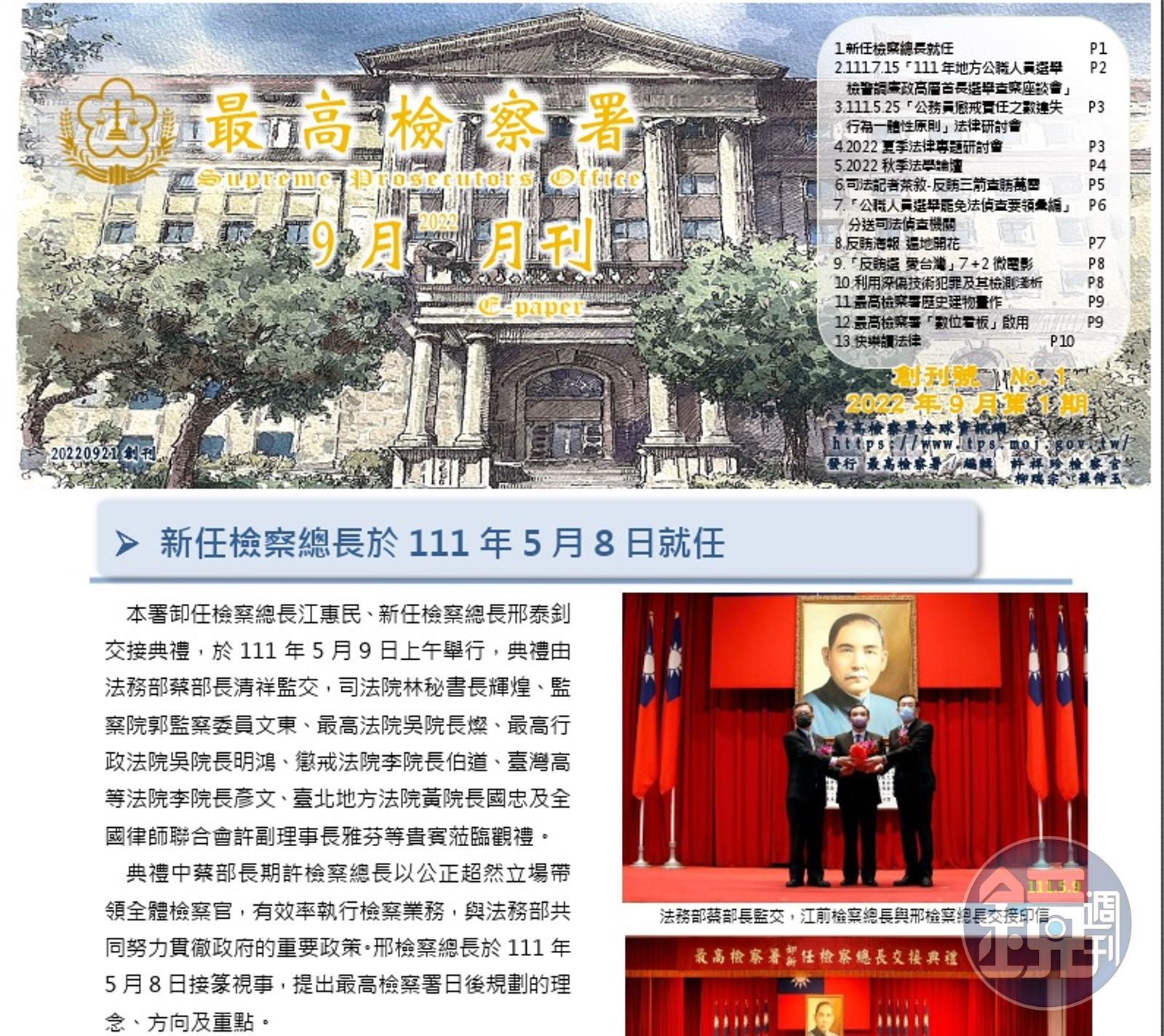 檢察總長邢泰釗說,該署電子報響應環保,創刊號於本月21日正式發行,刊登於該署全球資訊網首頁/重大政策/月刊,並以電子郵件發送,歡迎檢察官透過網路了解最高檢最新動態。