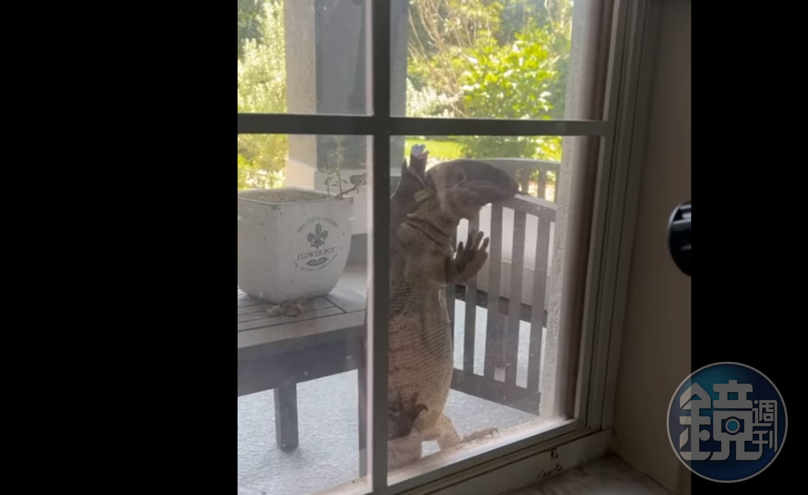 一名網友在臉書上傳影片,影片中民宅位於美國佛羅里達州奧蘭多市,事發當時為白天,網友兒子住宅落地窗外突然出現一條巨型蜥蜴,不時探頭張望屋內狀況,時而拍窗發出巨響,時而伸出細長舌頭好像打量獵物,蜥蜴站立時身高宛如小孩身高,嚇得她拿手機拍下嚇人場景,最後巨蜥沿落地窗往上攀爬,離開屋主視線範圍。影片下方網友多半也備受驚嚇,有人甚至留言表示:「難怪佛州每個人家中都有槍」,也有人覺得像是「哥吉拉寶寶」。
