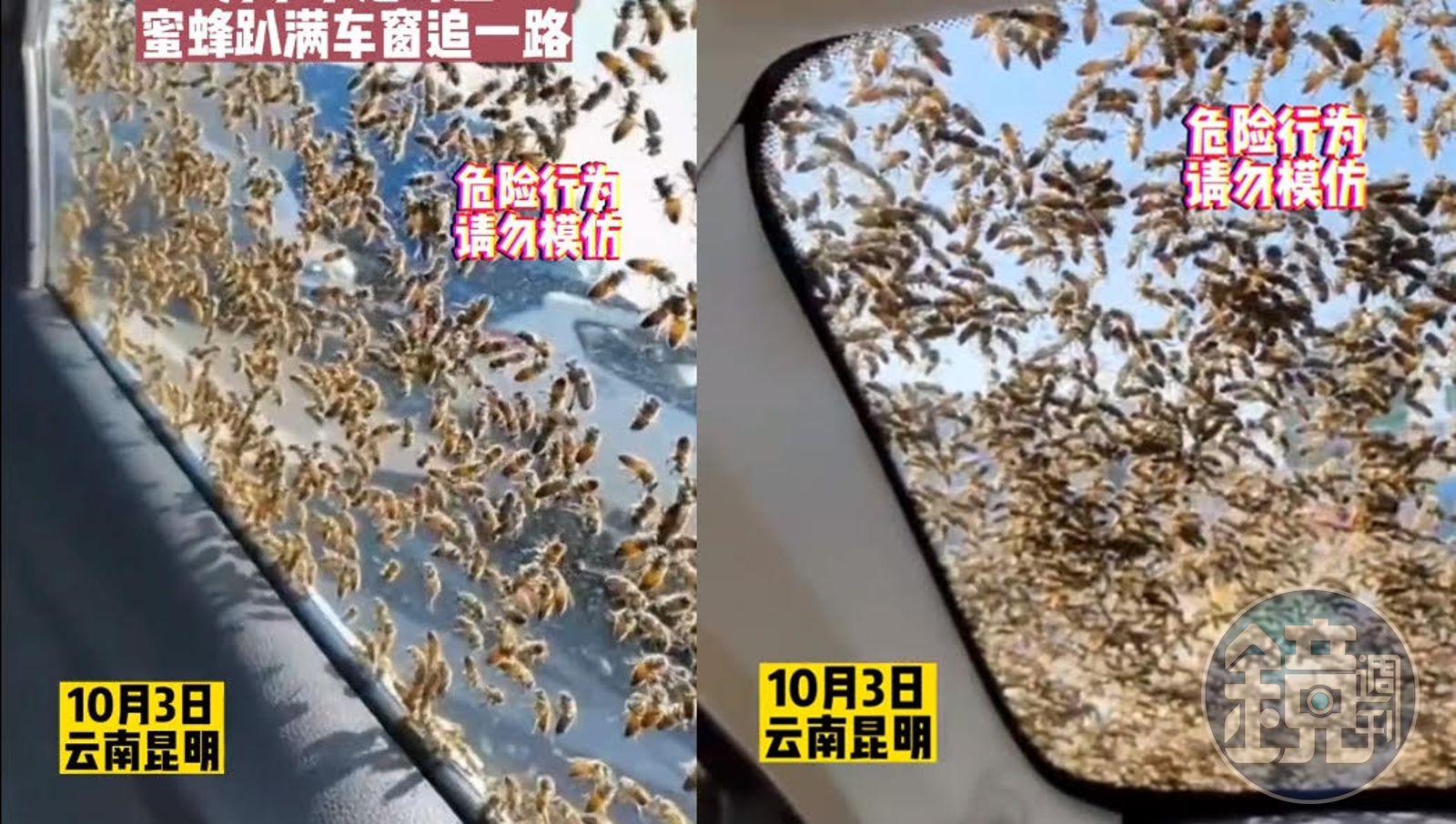 本月3日王姓男子與朋友開車出遊,路邊發現一窩野蜂,朋友竟用棍子將蜂王偷走,結果兩人一路被蜜蜂大軍追殺,甚至車窗爬滿蜂群遮住視線,在看不見的情況下危險駕駛一路加速,才藉由風吹把蜜蜂群吹散解圍。