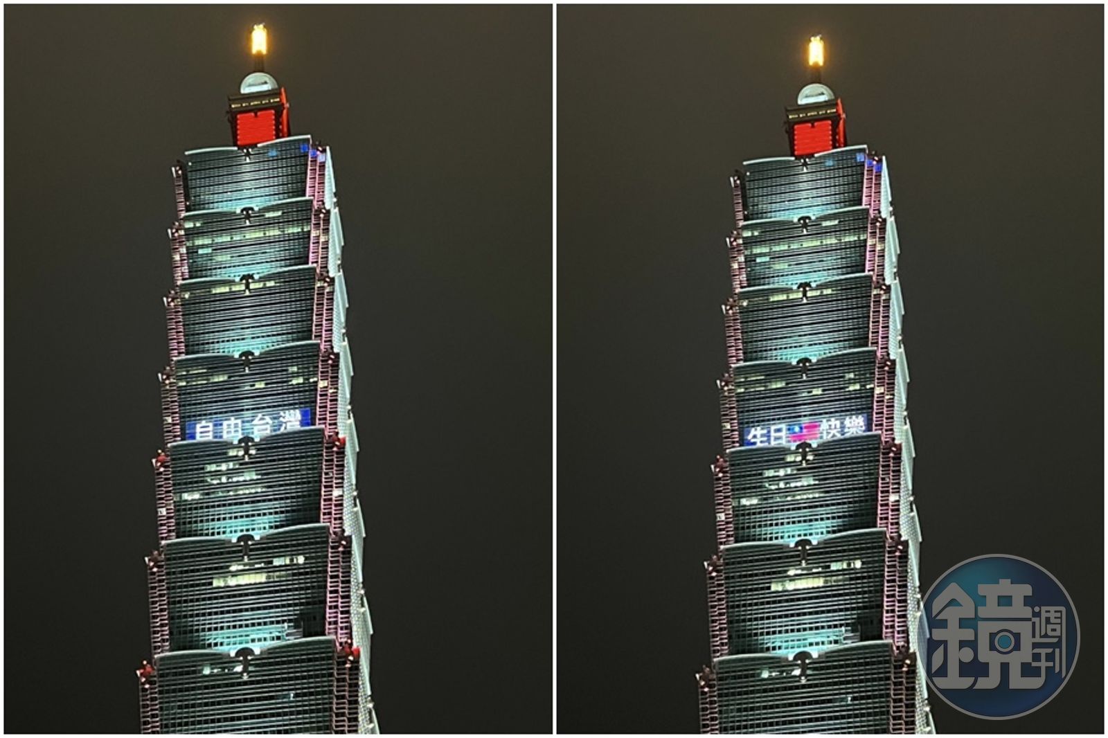 台北101晚間點燈文字包含,「自由台灣、美麗之島、民主國度、堅韌前行、全民齊心、歡慶國慶、生日🇹🇼快樂」,文字「生日快樂」的中間還有國旗圖案。