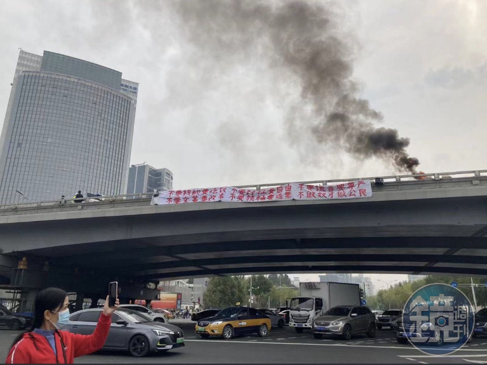 北京為了準備舉辦20大,警力布署嚴陣以待,然而13日上午在海淀區北三環的四通橋上,車輛人潮熙來攘往鬧區中,竟出現2條白色布條,上頭寫滿反習標語,包括:「不要核酸要吃飯,不要封控要自由,不要謊言要尊嚴,不要文革要改革,不要領袖要選票,不做奴才做公民。」以及「罷課罷工罷免獨裁國賊習近平」。