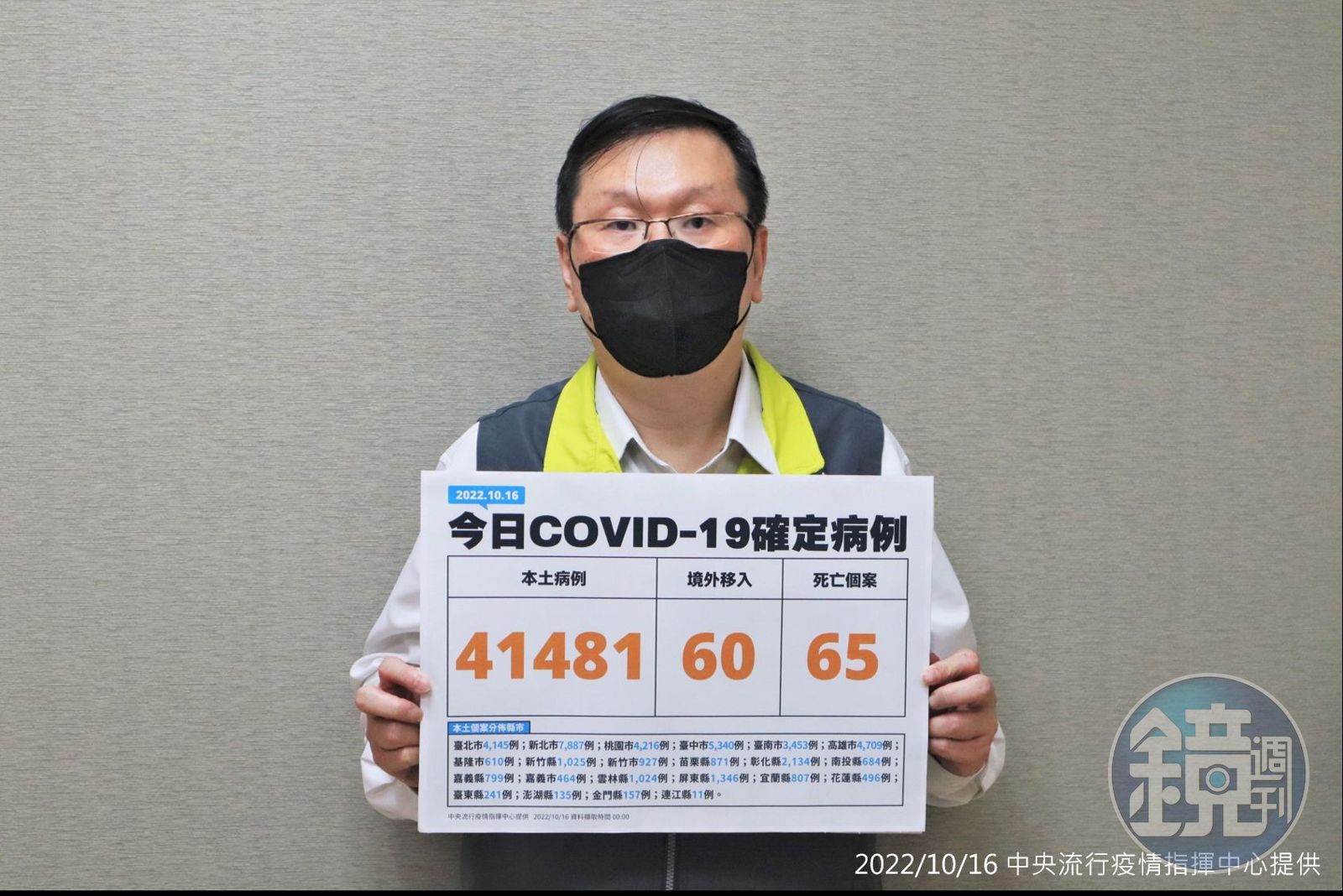指揮中心指出,今日新增65例本土病例死亡個案,為41例男性、24例女性,年齡介於30多歲至90多歲以上,皆屬重度感染、64例具慢性病史、50例未接種3劑以上COVID-19疫苗。確診日介於今(2022)年9月13日至10月14日,死亡日期介於10月6日至10月14日。