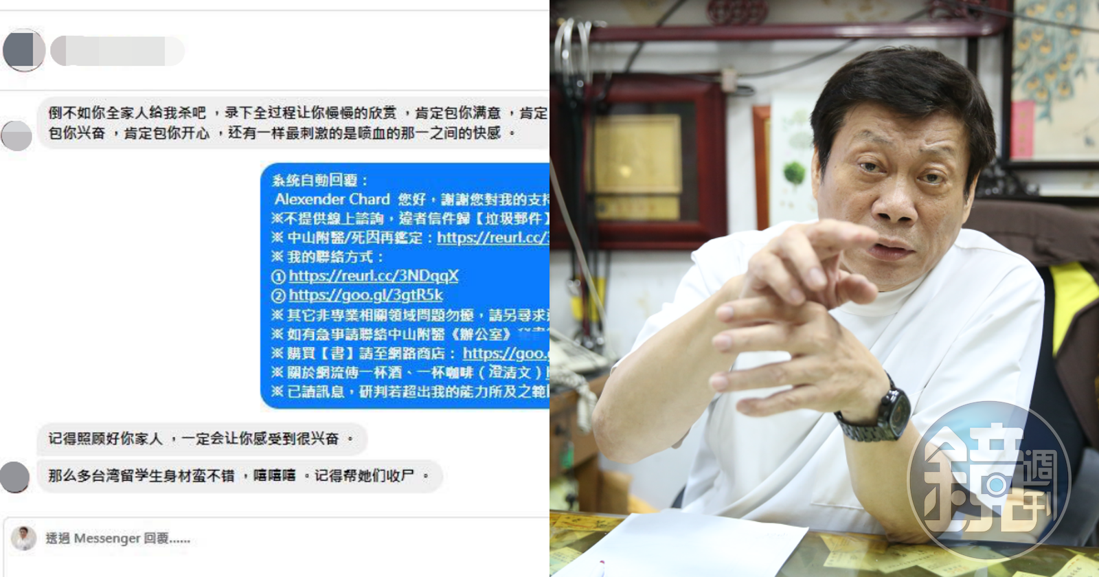 沒想到這番言論卻讓他收到恐嚇訊息,今(17日)高大成在臉書貼出截圖,只見他收到一些簡體字訊息,內容都相當不友善,諸如「X你媽 回覆啊 你全家死完了是嗎?」「我是馬來西亞人!我**你媽!」「支持你個XX 天天玩別人大體的病態法醫」,另有一名網友傳訊「倒不如你全家人給我殺吧」「記得照顧好你家人,一定會讓你感受到很興奮。」「那麼多台灣留學生身材蠻不錯,嘻嘻嘻,記得幫她們收屍。」高大成最後選擇對馬來西亞的用戶隱藏專頁,不與他們往來。