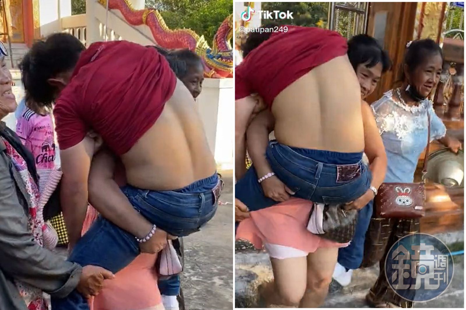 影片可見一名老婦人抱著一名長滿鬍子的成年男性,而且男子衣衫不整。原來是這名男子喝得酩酊大醉,完全不省人事,老媽媽心疼兒子,竟然獨自抱起已經成年的兒子,更以「撿屍巨嬰」般的姿勢,直接把醉兒抱上車內。由於男子的重量不小,因此媽媽把他抱上車時,車子還一度震了一下。