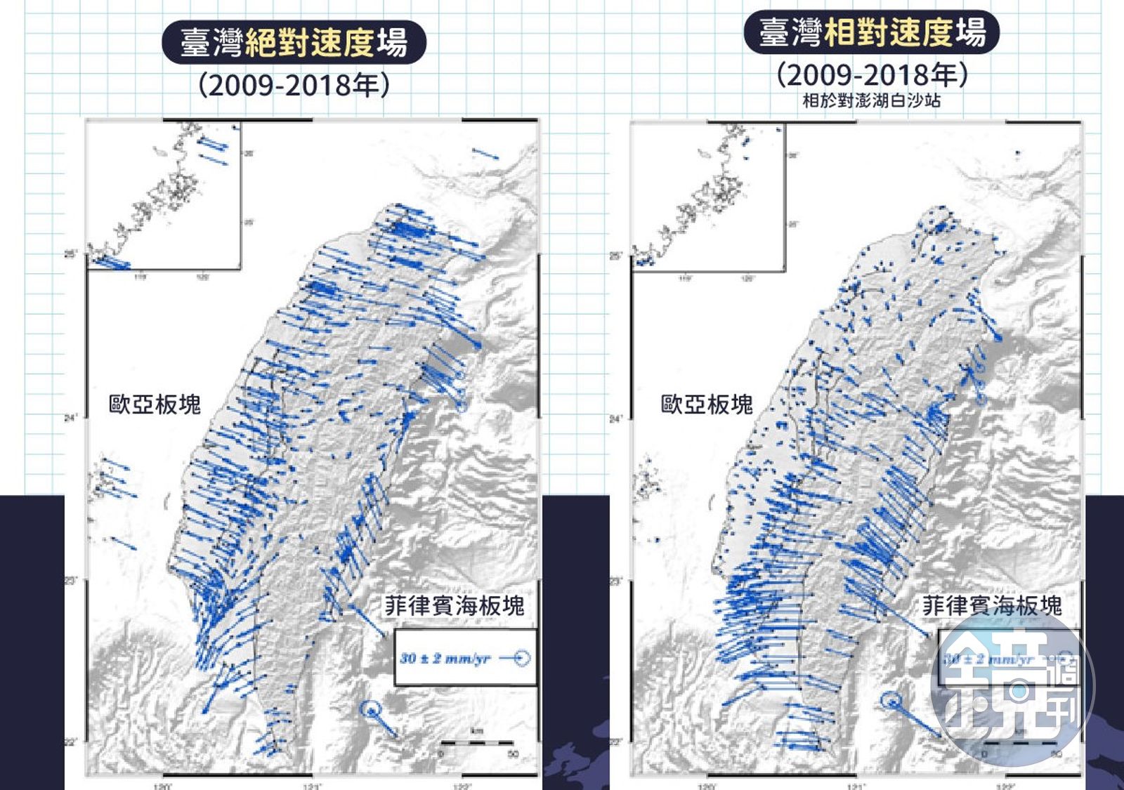 氣象局公布2009年至2018年,地震測報中心用Gamit繪製的台灣絕對速度場/相對速度場示意圖,藉由監測大地變形,地球科學家可以監視斷層、火山活動,以及地層下陷或滑動的一舉一動。