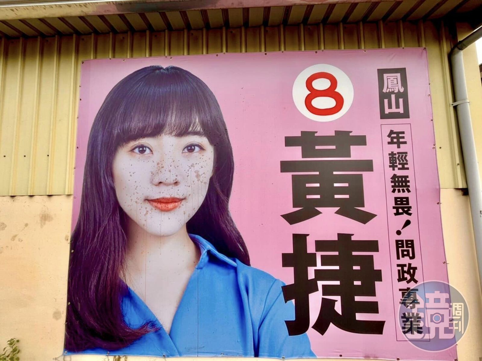 無黨籍高雄市議員黃捷力拚連任,今年5月份才有人蓄意破壞她的布條把「雙眼挖掉」,今(1日)她的選舉廣告又被亂噴檳榔汁,害她的整張臉都花了,照片曝光慘不忍睹。