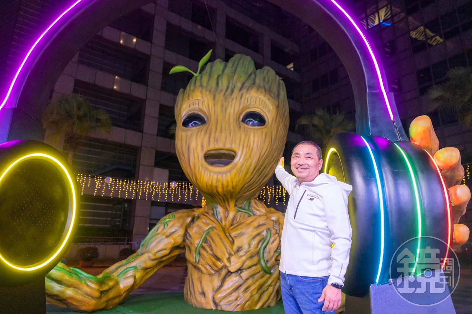 侯友宜和《冰雪奇緣》的雪寶耶誕樹、漫威英雄的格魯特,以及米奇、米妮一起合影。他說:「歡迎各位好朋友!來渡過一個溫馨、幸福、快樂、有家的氛圍的2022年末時光!」