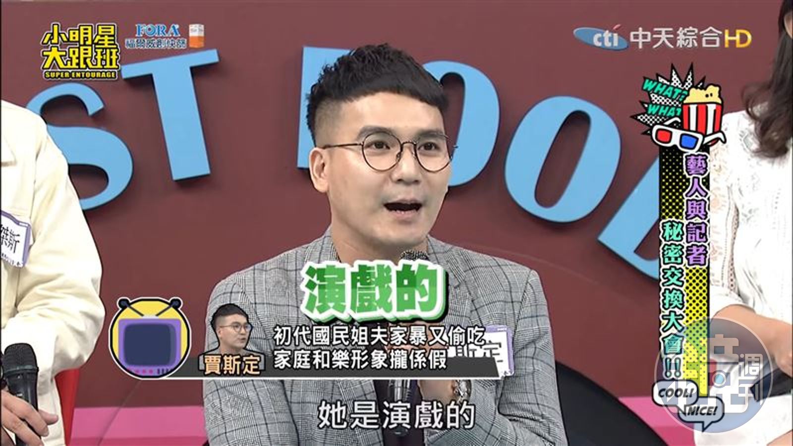 此外,賈斯定形容國民姐夫長期外地工作,夫妻聚少離多,然後女星跟這些小三、小四、小五彼此竟都知道對方存在,還會被嗆什麼時候離婚;吳宗憲聽了問說:「是演閩南語劇,台八吧?」賈斯定則回:「不能講!太明顯!」吳宗憲秒懂:「那就是了!」