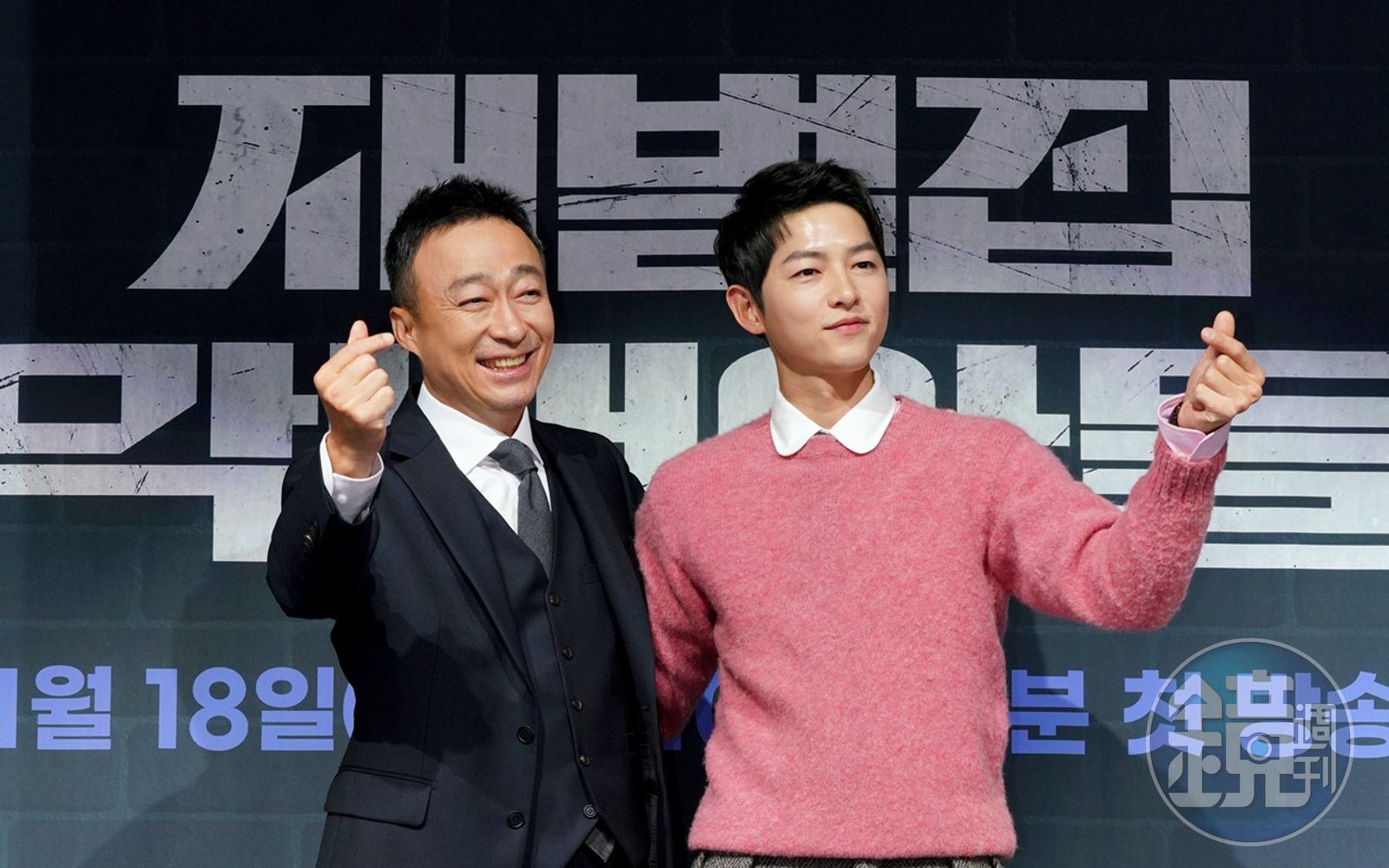 宋仲基(右)與李星民出席《財閥家的小兒子》記者會。(friDay影音提供)