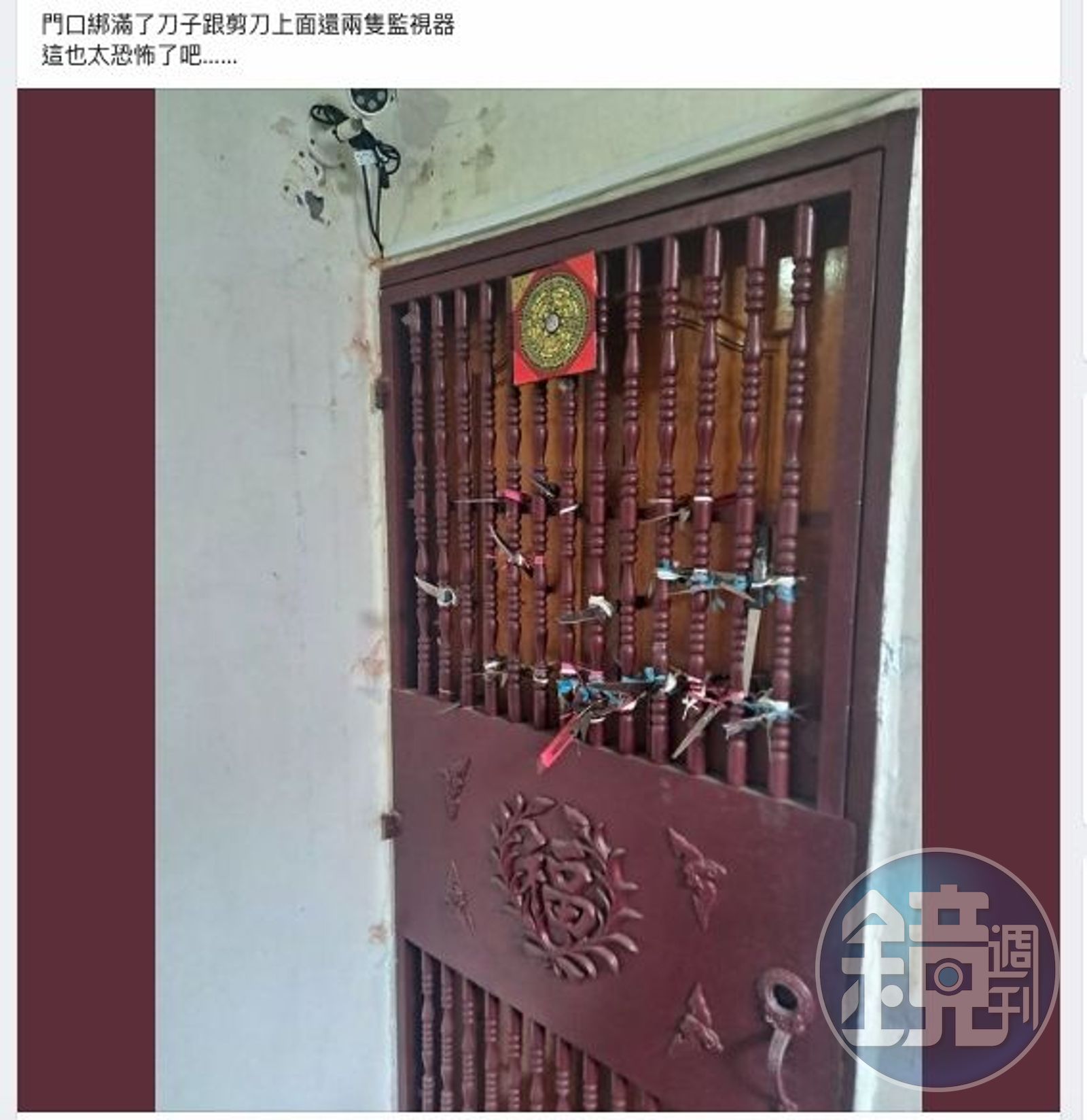 有網友在臉書社團「外送員的奇聞怪事」貼出這張驚悚的照片,圖中可見大門上綁滿了好幾把刀子,且鋒利的刀口對向門外,其中有牛排刀、水果刀、剪刀、美工刀等,加一加超過十支以上,更奇妙的是上面還掛一面風水羅盤,外加2個監視器鏡頭。