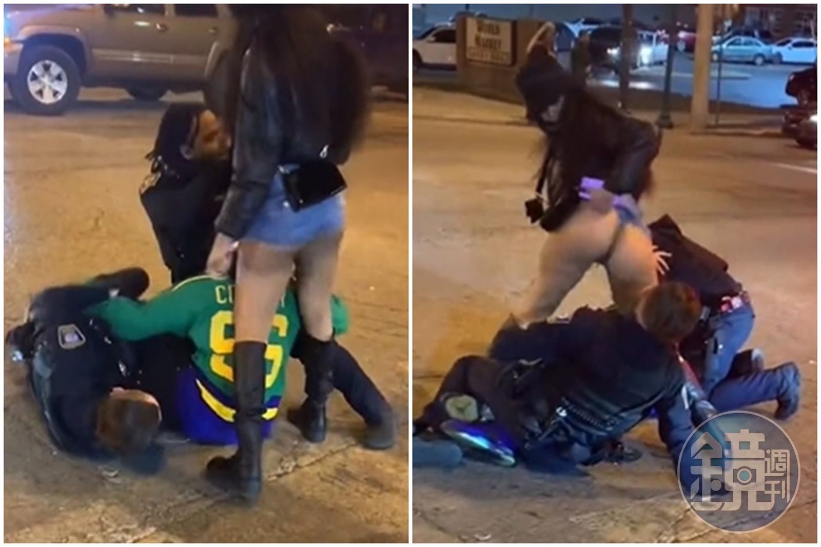 這時一旁的妹子衝上前想幫助同夥掙脫,無奈兩名警察遲遲不肯鬆手,她竟突發奇想,將臀部對準白人警方的臉瘋狂搖擺,企圖分散對方注意力,卻也因此讓整顆屁股蛋暴露於短裙外,丁字褲也被看光光,引起正在拍攝的目擊者忍不住大叫。
