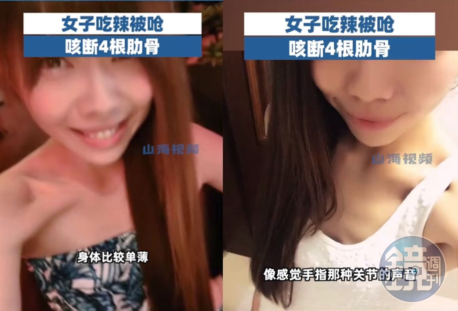 綜合陸媒報導,上海一名黃姓年輕女子近日吃辣時嗆到,咳嗽過猛,聽到胸口喀啦聲響,原以為是岔氣,但接著肋骨位置隱隱作痛,最後竟連呼吸也痛,也難以好好走路,著急前往醫院掛急診。