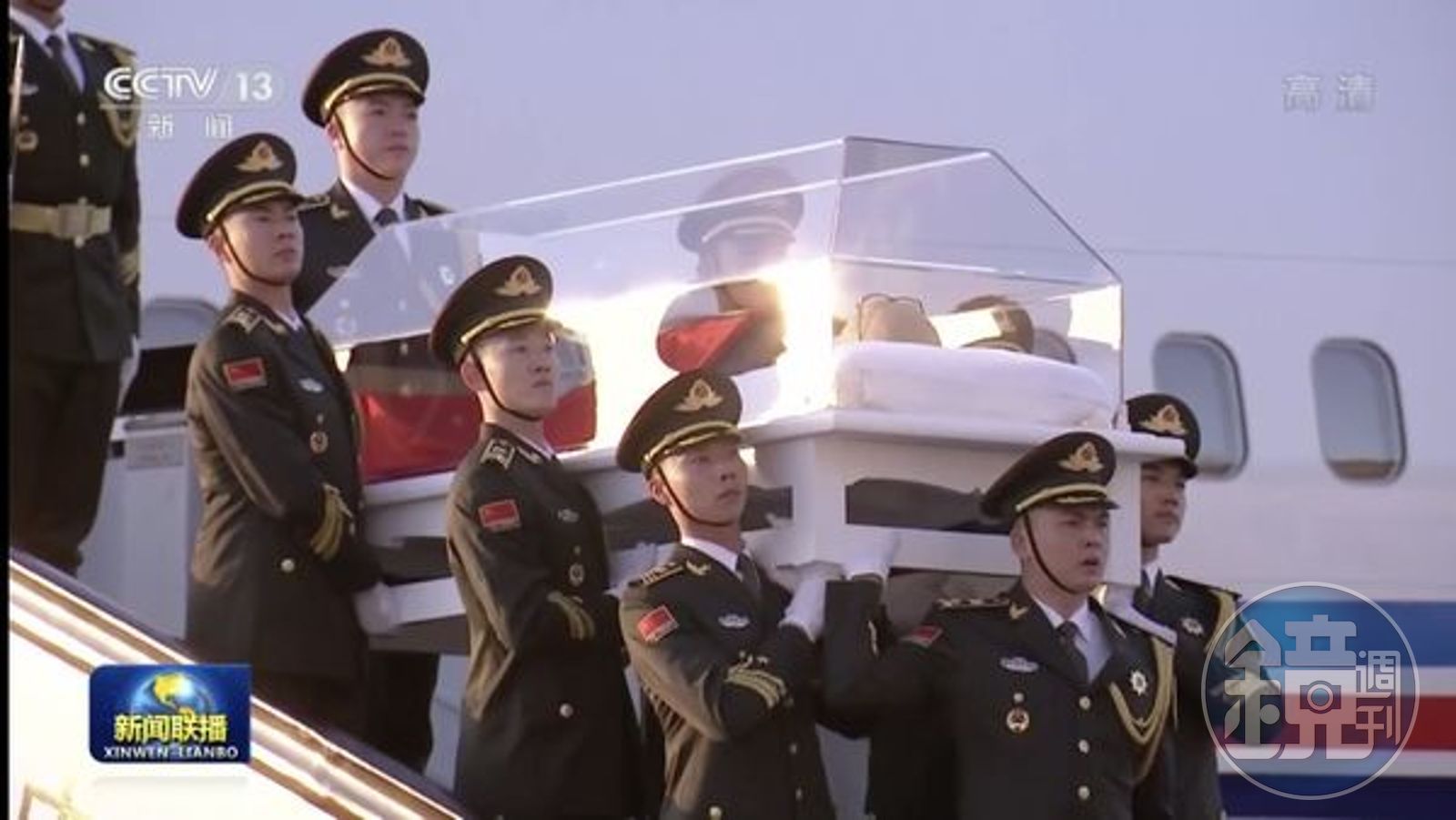 根據《央視》稍早釋出畫面,江澤民大體從上海移回北京,搭專機抵達西郊機場後,可以清楚看見江澤民大體穿著黑西裝躺在透明棺材裡,上面覆蓋紅色黨旗,且戴著招牌黑框眼鏡。