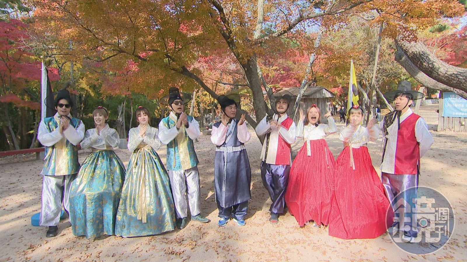 為了讓藝人們體驗韓國文化,節目組更特別準備了傳統韓服讓藝人們穿上,搭配在慶尚北道佛國寺的楓葉美景,隨便一拍都像是在看韓劇一般,讓大家拍照拍不停更是殺光現場底片!