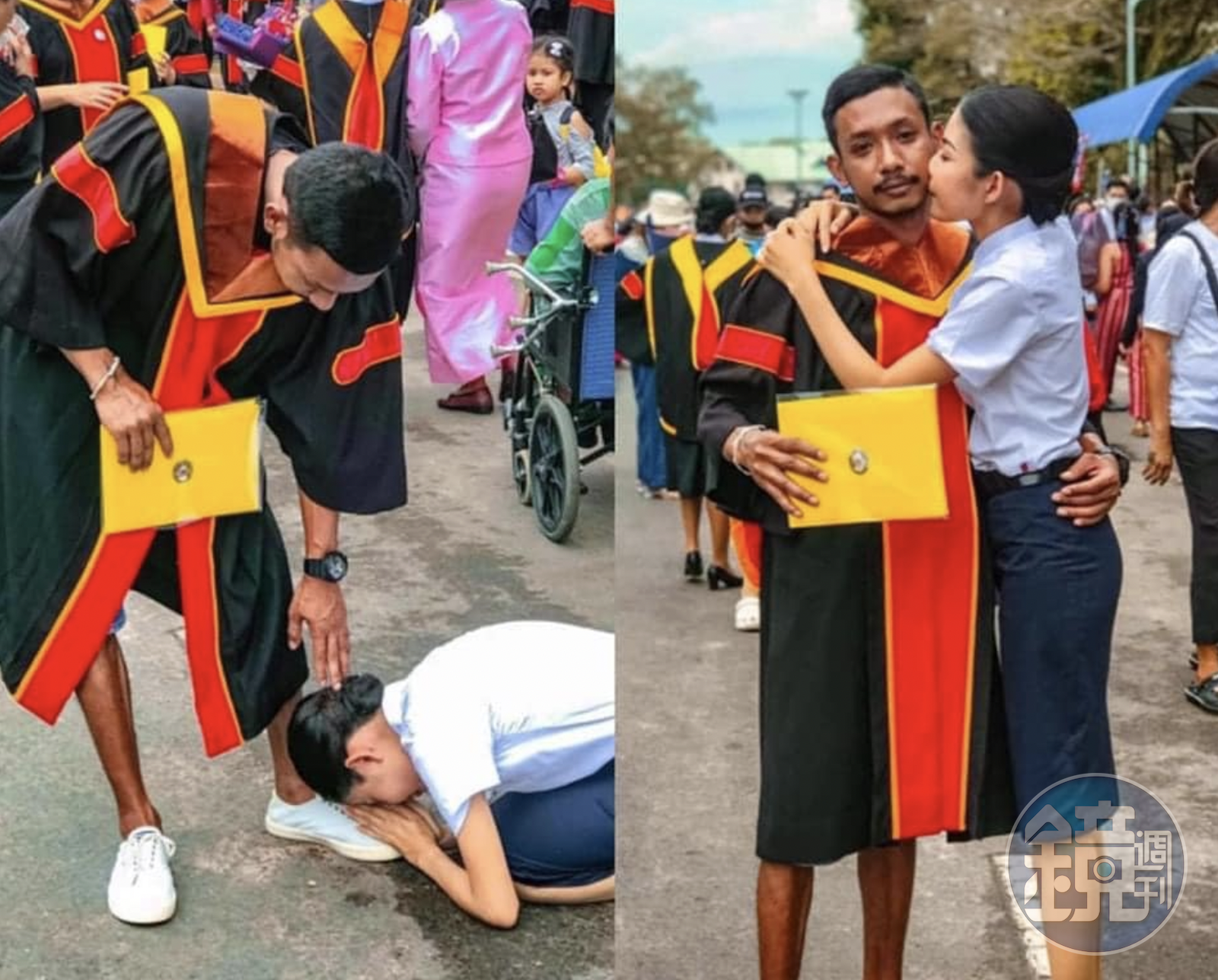 現代人學歷普遍都是大學畢業,近日一張照片在網路上引起熱議。一名泰國正妹在拿到畢業文憑後,向一名男子行五體投地大禮,更將雙手合十抵在對方腳上,看得出她對男子有著深深感謝。兩人關係也跟著曝光。