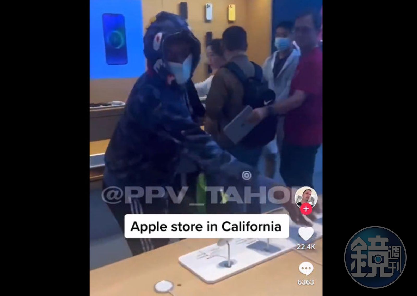 綜合外媒報導,11月25日正值美國「黑色星期五」購物節,許多人上街瘋狂採購,兩名蒙面非裔男子闖入美國加州帕羅奧圖市(Palo Alto)蘋果專賣店,無視一旁店內的顧客與店員,公然將櫃台展示的手機、筆電等商品扯下塞進包包,動作相當迅速。