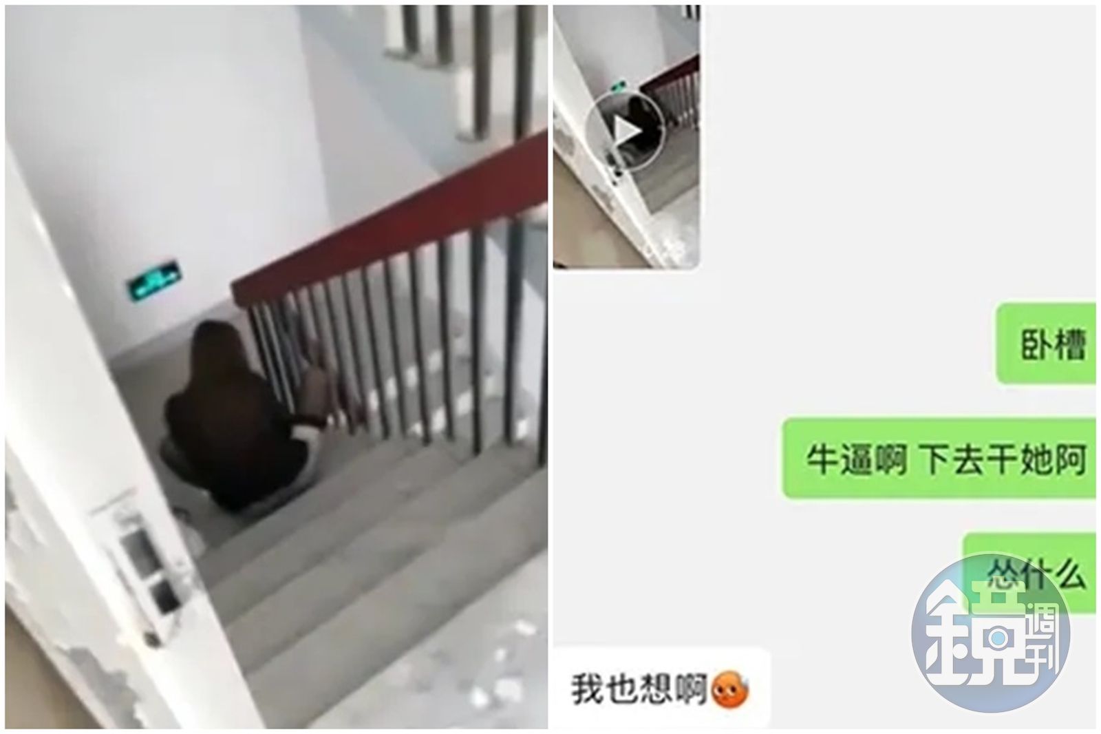 中國一名男網友透露,近日準備出門抽菸時,聽到樓梯間有聲音,「結果看到H主播在鄰道扣13」,隨即還傳了一段側錄影影片給朋友看。只見影片截圖畫面,一名長髮女子坐在樓梯間,雙腿大開,似乎在直播自慰影片,讓原PO朋友看到傻眼直呼「牛逼啊」。 消息一曝光,隨即掀起大票網友在微博上討論,不少中國網友表示,「網上看著覺得挺色的,現實裡碰到感覺挺瘋的」「學日本?都成產業鏈了」「這不怕下面上來人嗎」「問缺不缺演員」。 ★《鏡週刊》關心您:抽菸有害身心健康。