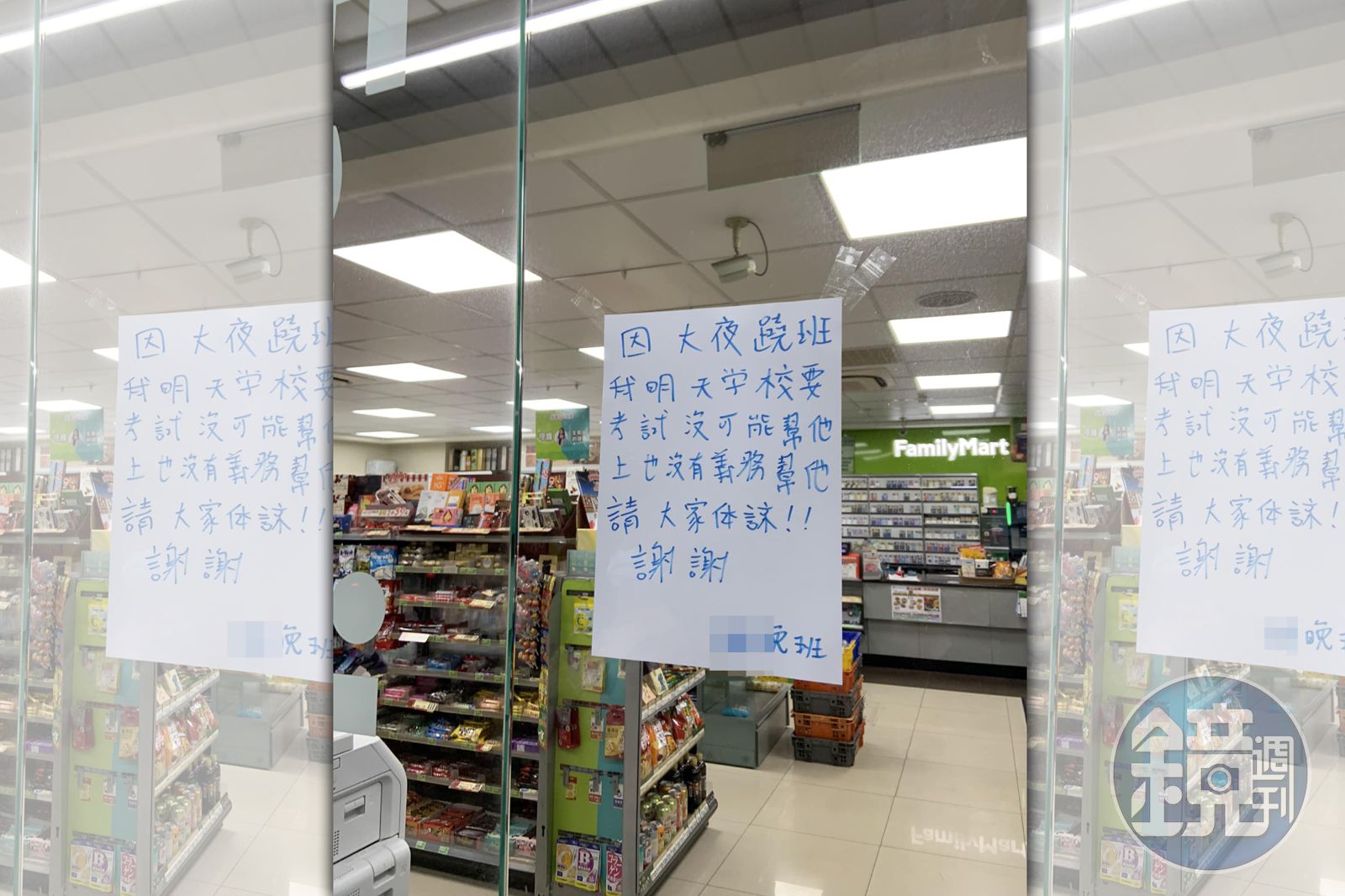 一名網友今天凌晨在臉書「路上觀察學院」分享一張超商門口手寫的公告,「因大夜蹺班,我明天學校要考試,沒可能幫他上,也沒義務幫他,請大家體諒!!謝謝!」
