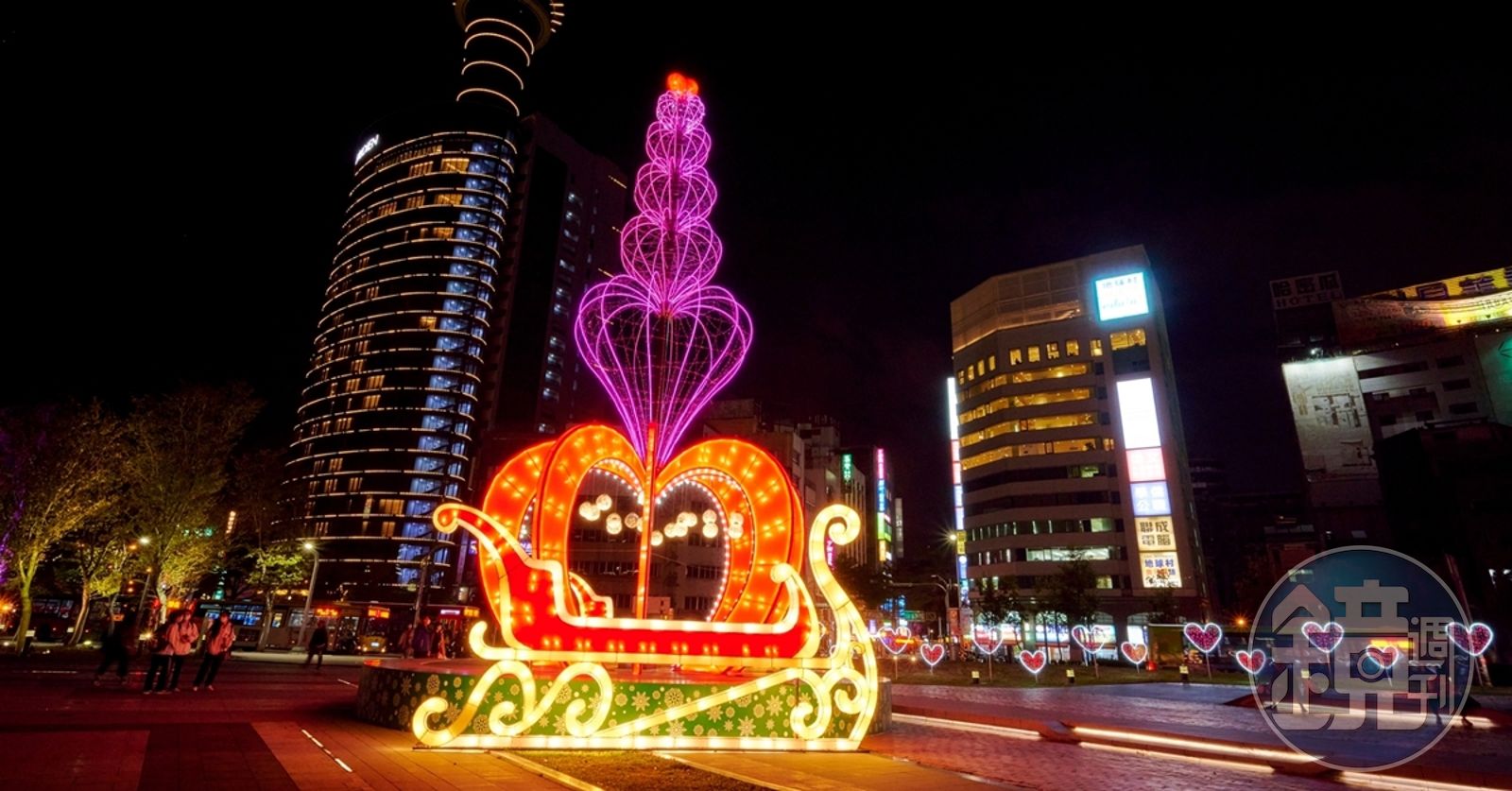 來到舊火車站前廣場,高達15公尺的「心花朵朵」耶誕樹聳立於廣場中央。耶誕樹基底為雪橇造型,樹身則由數個巨大的愛心堆疊而成,最重要的是這棵耶誕樹還會360度旋轉,讓「心」「動」起來,與民眾一同在今年的耶誕佳節裡感受浪漫、「心動於中」!