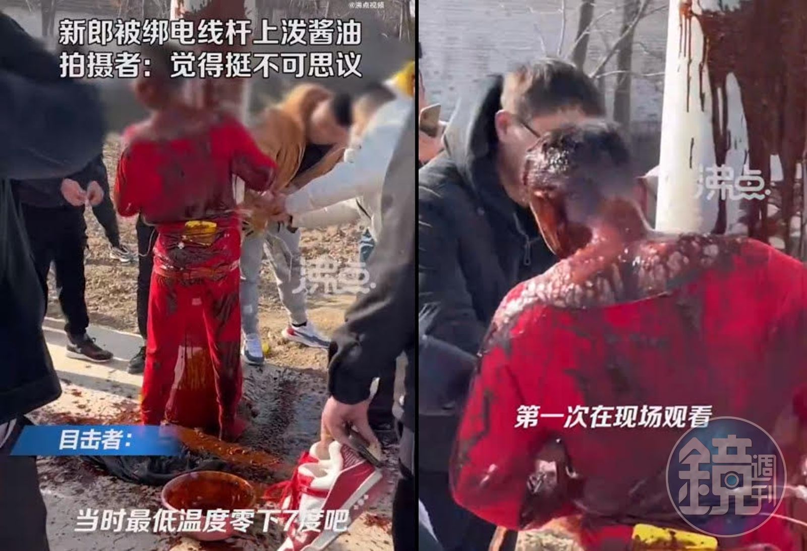 根據「沸點視頻」微博影片顯示,一名新郎在12月15日迎娶新娘,沒想到接完新娘後,被堵在村口的友人拉下車,將他用膠帶五花大綁綁在電線桿上。當天溫度低到零下7度,讓新郎凍到直發抖,朋友還加碼在他身上潑醬油和豆瓣醬,冷吱吱的溫度讓新郎狼狽向旁人求饒,卻沒人理會,還越鬧越歡。
