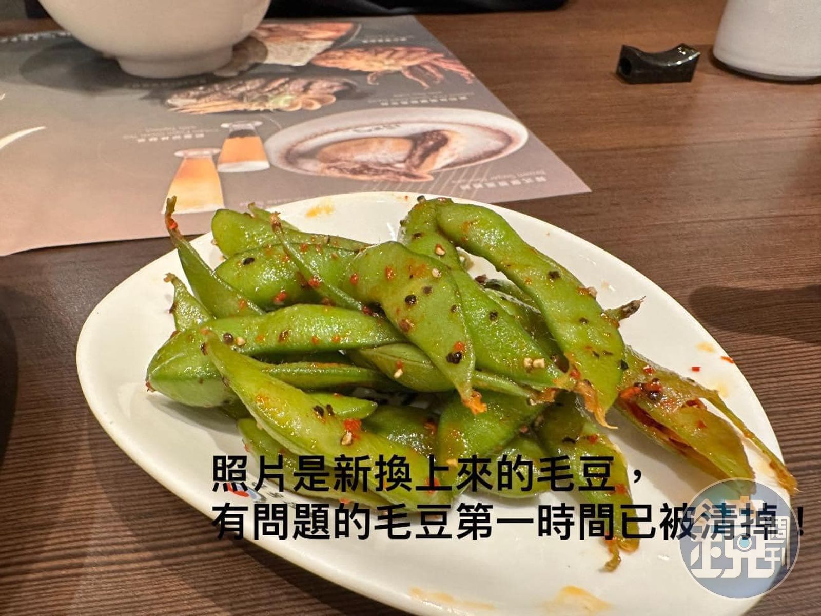 原PO在臉書《爆怨公社》發文抱怨,她跟老公19日晚間去某連鎖韓食餐廳吃飯,服務生上了一盤小菜,有豆芽菜、南瓜、毛豆等,「我還開心說:耶!有我愛吃的毛豆耶!立馬夾了一條放嘴巴,咦?為什麼豆莢裡沒毛豆?我老公懷疑的看了我一眼也夾了一條放嘴巴,豆莢裡一樣沒毛豆!我馬上檢查盤裡的毛豆,全是空的!」